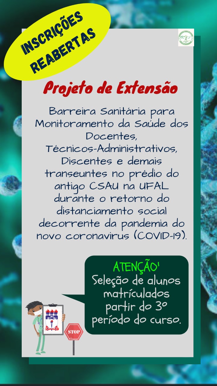 O formulário de inscrição está disponível no link https://docs.google.com/forms/d/e/1FAIpQLSdFUE4_fJgxtB8CXr_eKVSkaQHu_X1j2eJ7sQQ7EnnSjVMElw/viewform e maiores informações sobre o projeto podem ser obtidas em sua página oficial (http://www.ufal.edu.br/unidadeacademica/esenfar/pt-br/graduacao/enfermagem/projetos-de-extensao/barreira-sanitaria-para-monitoramento-da-saude-dos-docentes-tecnicos-administrativos-discentes-e-demais-transeuntes-no-predio-do-antigo-csau-na-ufal-durante-o-retorno-do-distanciamento-social-decorrente-da-pandemia-do-novo-coronavirus-covid-19)