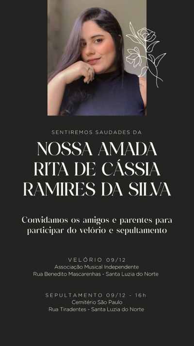 A Escola de Enfermagem decreta três dias de luto em decorrência do falecimento da estudante do curso de graduação em enfermagem Rita de Cássia Ramires da Silva, ocorrido dia 08/12/2024, seu sepultamento aconteceu neste dia 09/12/2024, às 16h00m, no Cemitério São Paulo, situado no município de Santa Luzia. Rita foi uma aluna muita dedicada, esforçada, de bom relacionamento, superou muitos desafios e agora nos deixa muita saudade.
